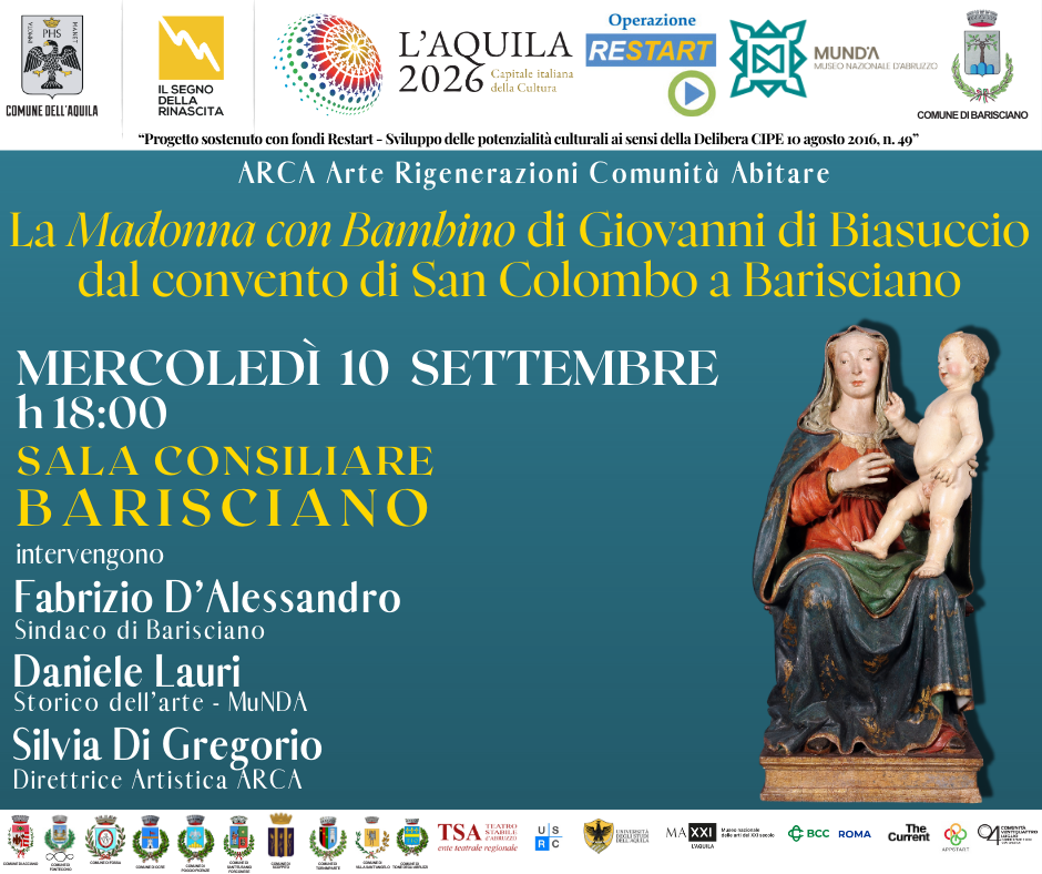 Il Museo Nazionale d’Abruzzo il 10 agosto alle 18 parteciperà al progetto A.R.C.A. – Arte, Rigenerazioni, Comunità, Abitare – con un quarto incontro pubblico nel Comune di Barisciano, in cui interverrà il funzionario storico dell’arte Daniele Lauri, volto a divulgare la conoscenza dell’opera Madonna con Bambino proveniente dal convento di san Colombo a Barisciano.