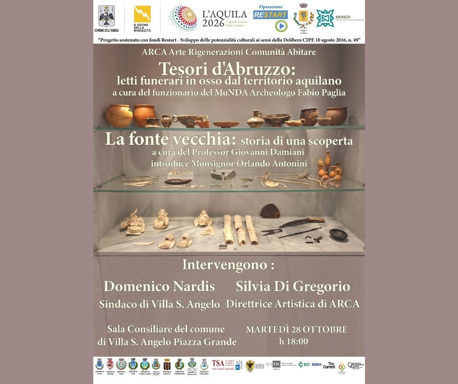 Il Museo Nazionale d’Abruzzo il 28 ottobre alle 18 parteciperà al progetto ARCA – Arte, Rigenerazioni, Comunità, Abitare – con un settimo incontro pubblico nel Comune di Villa Sant’Angelo, in cui interverrà il funzionario archeologo Fabio Paglia, per presentare i letti funerari in osso provenienti dal territorio dei Vestini.