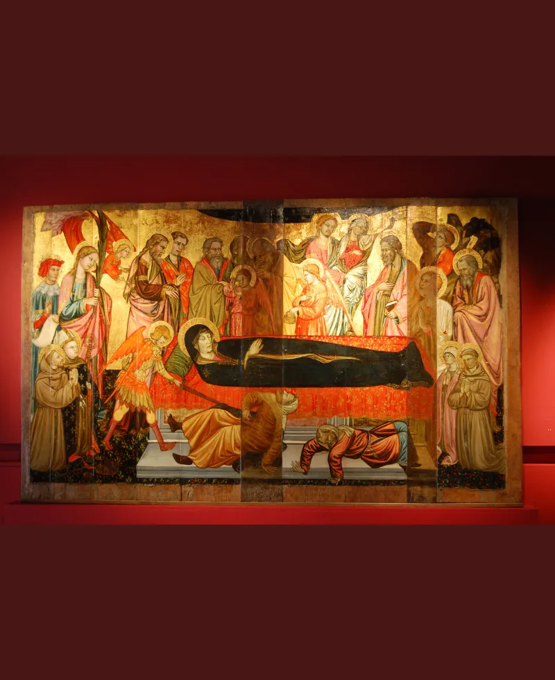 Il 14 ottobre la mostra Nuove acquisizioni, che rimarrà aperta al pubblico fino al 5 novembre, si completa con l’arrivo di un capolavoro, la grande tavola eseguita a tempera su fondo oro dal Maestro del Trittico di Beffi, la Dormitio Virginis, alta espressione dell’arte abruzzese di fine Trecento.