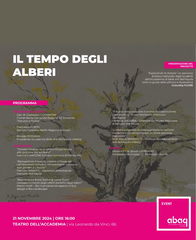 On November 21st at 4:00 PM, the seminar “The Time of Trees” will take place at the Theatre of the Academy of Fine Arts in L’Aquila, located at Via Leonardo da Vinci 6b. Organized by the Carabinieri Regional Command, Forestry Nucleus of Abruzzo and Molise, L’Aquila, the seminar will be attended by Federica Zalabra, Director of the National Museum of Abruzzo.