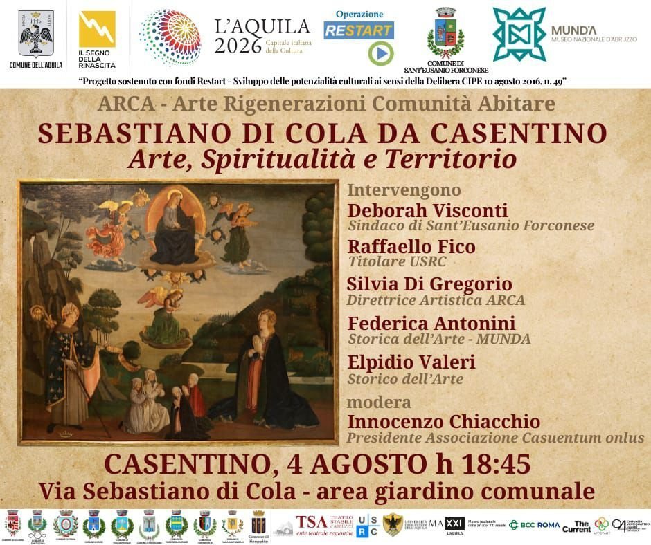 On August 4th at 6:45 PM, the National Museum of Abruzzo will participate in the A.R.C.A. project – Art, Regeneration, Community, Living – presented in Barisciano on July 15th, with an initial public meeting in the Municipality of Sant’Eusanio Forconese. Art historian Federica Antonini will speak at the meeting. The aim is to raise awareness of some of Sebastiano di Cola da Casentino’s artworks held in the Museum, connecting them to their local area of origin, also as repositories of collective and individual memories.