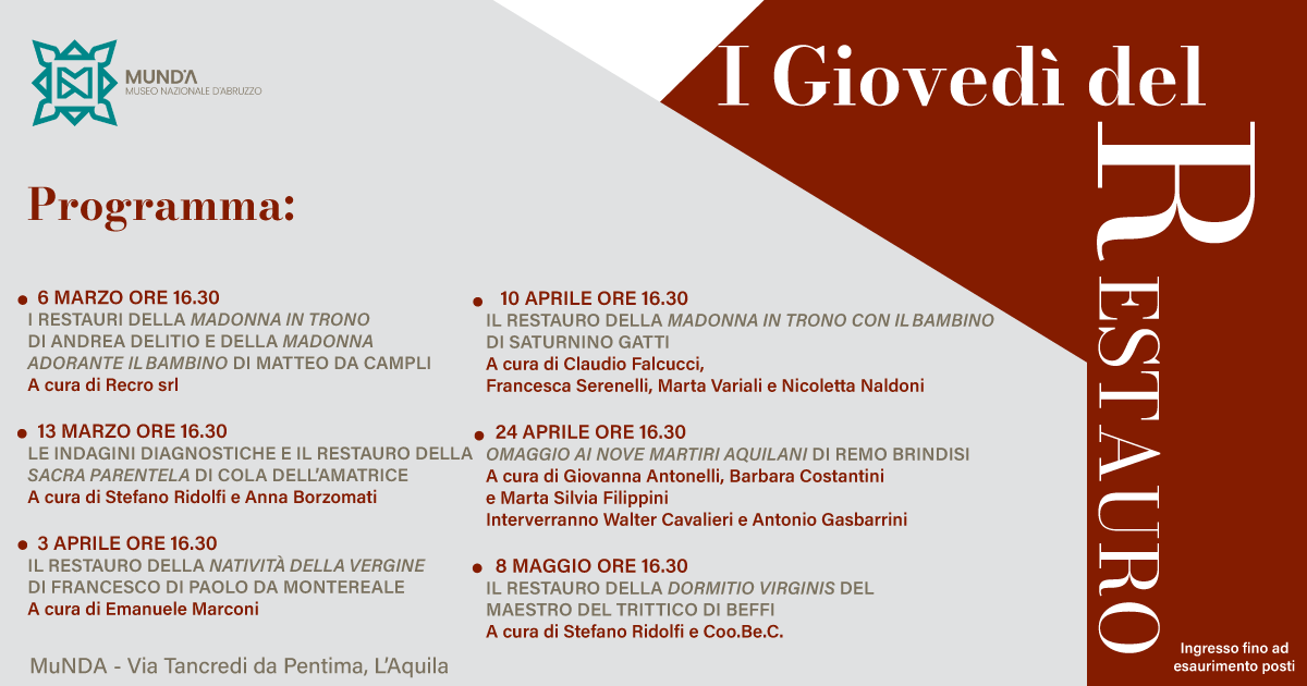 Il Museo Nazionale d’Abruzzo dell’Aquila organizza dal 6 marzo all’8 maggio 2025 I giovedì del restauro, iniziativa di divulgazione dell’attività scientifica del museo con presentazione delle attività di diagnostica non invasiva e di restauro delle opere d’arte e visite guidate ai dipinti restaurati.