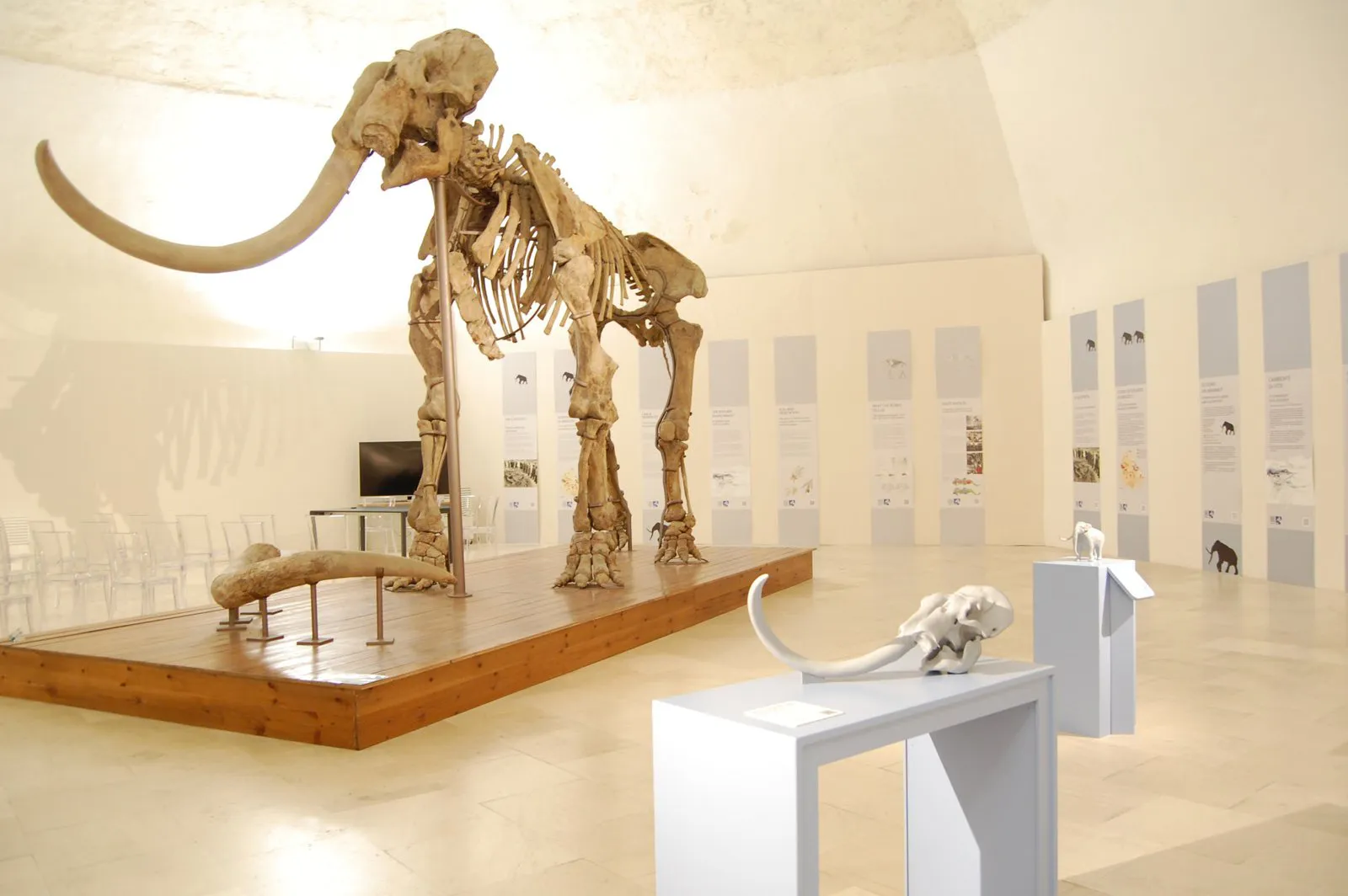 Sarà così possibile “entrare” all’interno dell’apparato scheletrico e muscolare del Mammut e conoscere quelle particolarità non sempre percepibili a distanza con la sola vista: il lato sinistro del cranio risulterà al tatto irregolare perché privo di zanna, così come si potranno apprezzare, nella cavità orale, due molari inferiori e due superiori che hanno permesso di stimare l’età dell’animale alla morte, 55 o più anni.