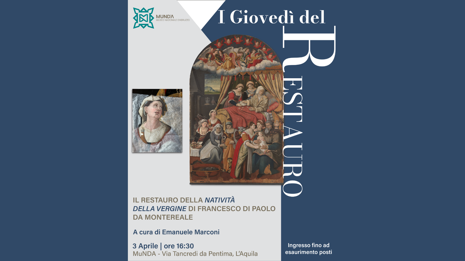 Nell’ambito del ciclo di incontri I giovedì del restauro, il 3 aprile alle ore 16.30 il restauratore Emanuele Marconi illustrerà le operazioni relative alla pratica multidisciplinare del restauro del dipinto su tavola, la Natività della Vergine eseguito dopo il 1531 da Francesco Di Paolo da Montereale, di nuovo esposto nel luglio 2024 nel percorso di visita del Museo Nazionale d’Abruzzo dell’Aquila.