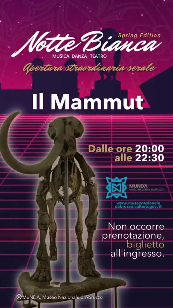 Ad accompagnare i numerosi eventi della “Notte bianca” del 1 giugno, organizzata dal Comune dell’Aquila, sarà presente anche  il MuNDA – Museo Nazionale d’Abruzzo, con l’apertura straordinaria serale del Mammut al Castello cinquecentesco dell’Aquila.
