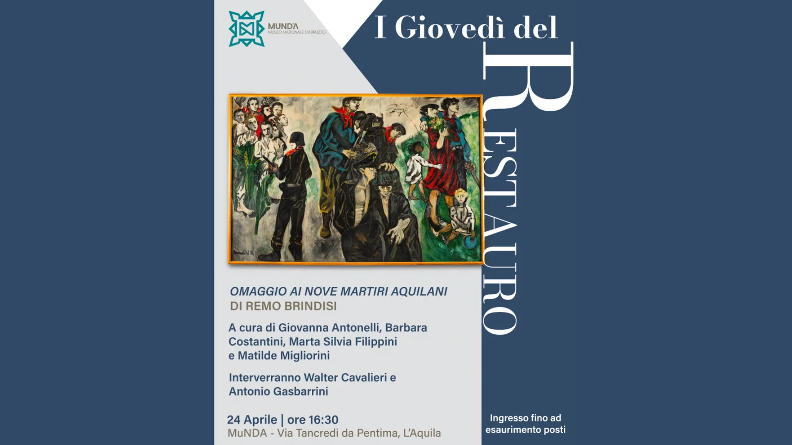 Il 24 aprile alle ore 16.30 nella sede di Borgo Rivera del MuNDA sarà narrata un’opera d’arte capace di rievocare la storia d’Italia: il dipinto a tecnica mista su supporto ligneo Omaggio ai nove martiri aquilani/Lottiamo per la pace di Remo Brindisi, autografato sul recto e datato 1954, è un manufatto polimaterico e bifacciale di grandi dimensioni 244 x 364 cm, per un peso complessivo di circa 150 Kg.