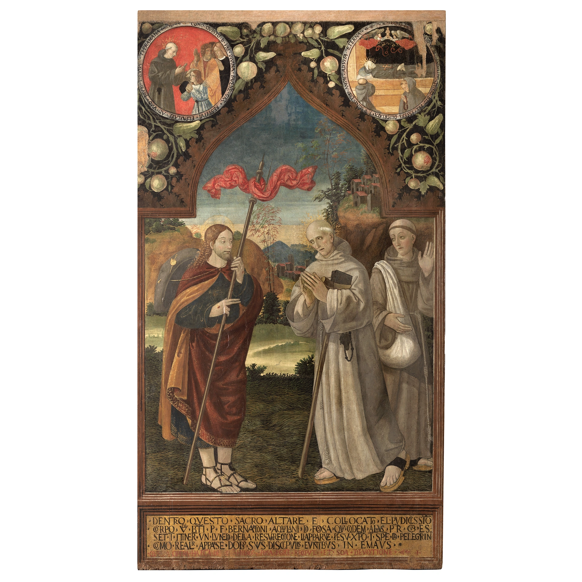 Cristo si manifesta a Bernardino da Fossa e a un suo compagno in veste di pellegrino così come apparve ai due discepoli sulla via di Emmaus. Certa l’attribuzione a Francesco di Paolo da Montereale, la fattura grossolana di certi particolari come il piede sinistro, permette di ipotizzare la presenza di aiuti. L’iscrizione in calce riporta il nome del committente Girolamo da Fossa.