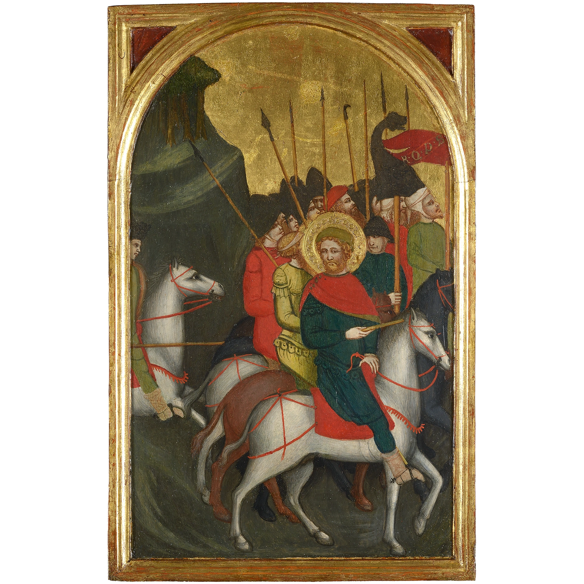 L’episodio, rappresentato nella terza scena del terzo registro della Custodia, mostra il momento in cui Eustachio si avvia al campo di battaglia con il suo esercito. La scena si svolge da sinistra verso destra, con Eustachio a cavallo in primo piano che, attraversando una campagna brulla, conduce il suo esercito verso il nemico. Sulla sinistra, un cavaliere entra per metà nella scena, e al di là del capitano, un folto gruppo di soldati e di cavalieri in marcia ergono picche e uno stendardo, sul quale sono impresse le lettere S.P.Q.R. in oro. Le lettere si ripetono identiche sul petto della statua lignea di Eustachio. Lo strano cappuccio, oggi nero, che segue la bandiera, un tempo era di lucente argento. Probabilmente è un draco, uno stendardo metallico, a forma di testa di drago o di lupo, usato dall’esercito romano.