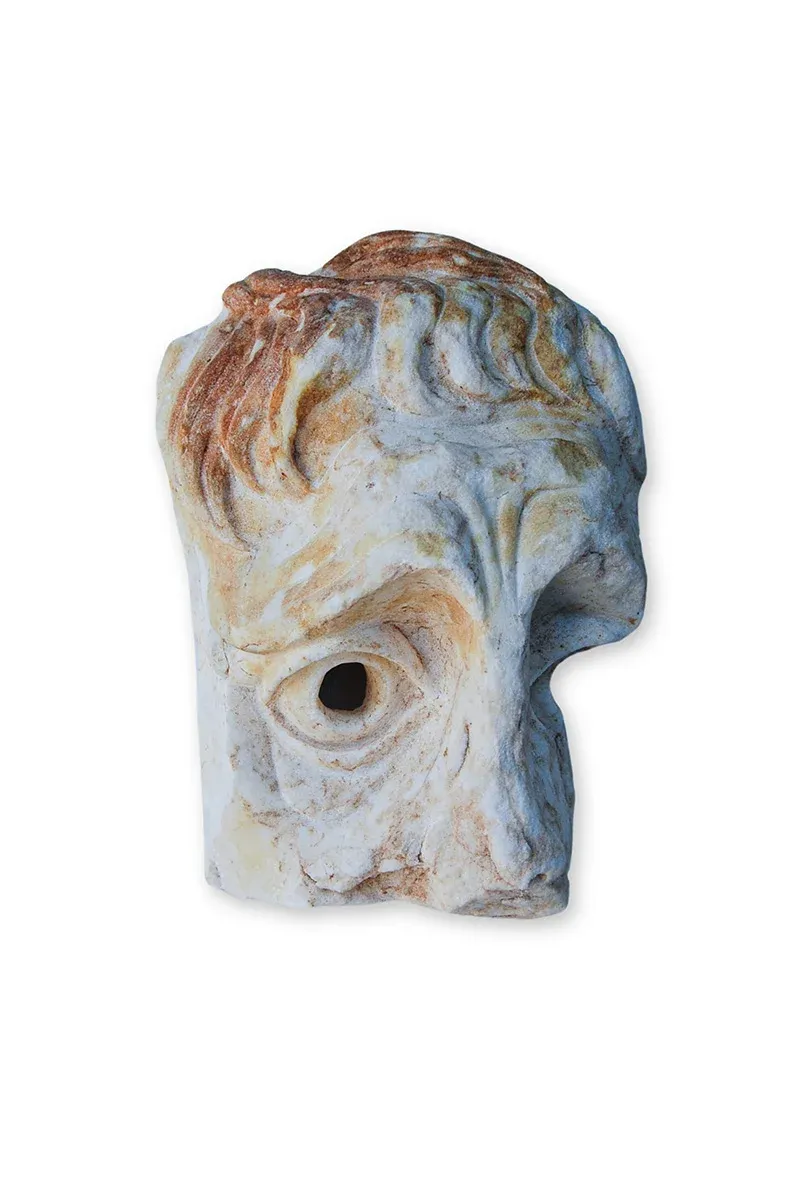 Anche se lo stato di conservazione non è ottimale, le caratteristiche del volto sono assimilabili a quelle di un personaggio delle tragedie antiche: lo schiavo. La lavorazione delle sopracciglia e delle rughe sul volto è molto simile a quella di una maschera proveniente dal teatro romano di Parma, che rappresenta un buon parallelo per datare questo oggetto entro il primo venticinquennio del I sec. d.C.