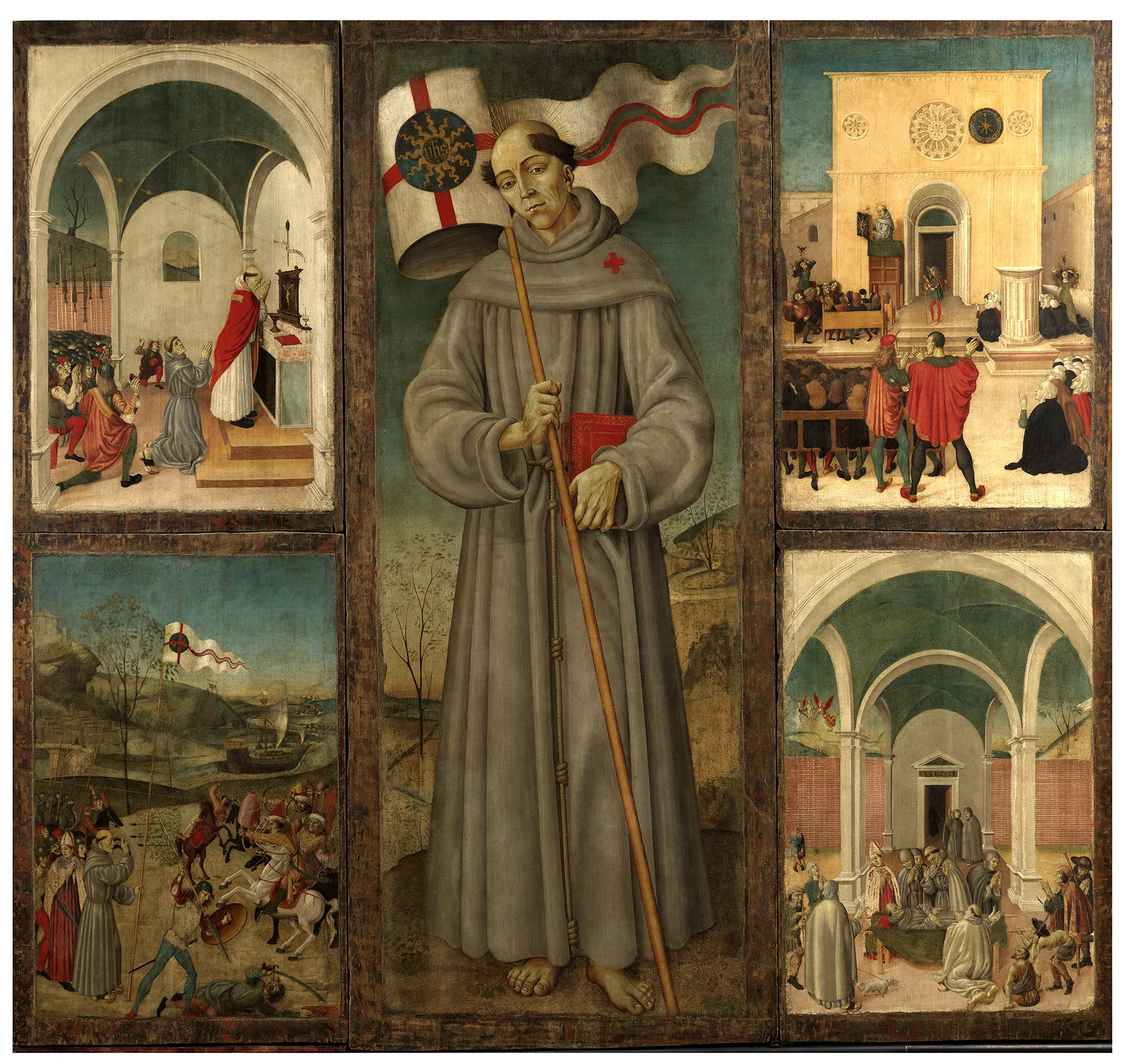 Proveniente dalla basilica di San Bernardino e smembrato in cinque differenti pannelli, il polittico è stato ricomposto in più occasioni dall’inizio del XX secolo. L’assetto attuale è il frutto di un restauro compiuto nel 1948, e mostra al centro la figura di Giovanni da Capestrano, con raggiera dorata e coperto dal saio francescano, mentre regge lo stendardo crociato con il monogramma di san Bernardino da Siena. Nei pannelli laterali sono rappresentati quattro episodi miracolosi della sua vita. In alto a sinistra la Messa di Peterwardein per i crociati prima della battaglia contro i Turchi, con l’annuncio divino della vittoria, mentre in basso la Battaglia di Belgrado (1456) con la miracolosa inversione della rotta delle frecce avversarie. Sulla destra, in alto, la Predica all’Aquila (1426) con la liberazione degli indemoniati e, in basso, la Morte di Giovanni da Capestrano a Ilok (1456) con il risanamento di storpi e malati. L’ordinamento non segue una progressione cronologica, che doveva probabilmente essere rispettata in origine.