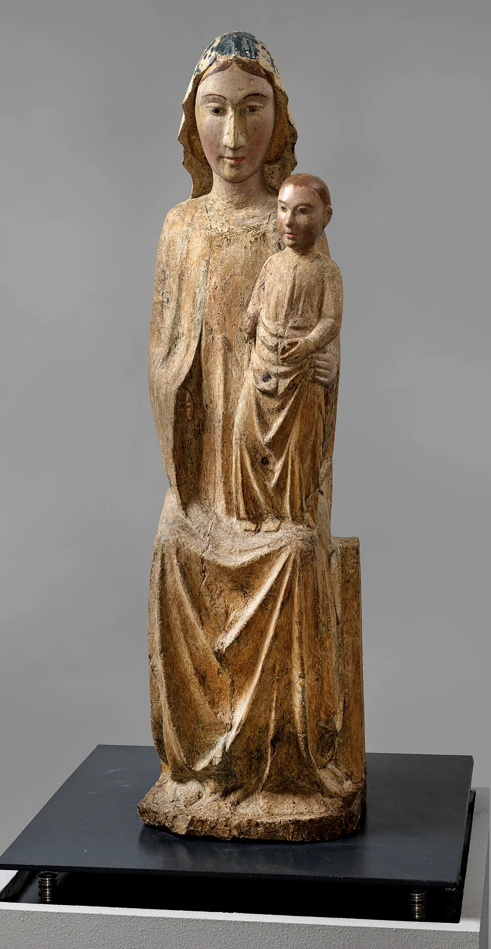 La Madonna è seduta in posizione frontale su uno scanno. Con il braccio sinistro cinge il Bambino, rappresentato in piedi sulle sue ginocchia e con in mano una piccola sfera. Per il volto della Vergine l’artista ricorre al suo inconfondibile modulo: volto accentuatamente ovale, mento piccolo, ampie arcate sopracciliari, naso affilato, labbra sottili e occhi a mandorla all’orientale. L’opera ha perduto la sua originale policromia, di cui rimangono solo tracce frammentarie di colore. Il retro si presenta liscio ma non scavato. Opere del medesimo tipo di questo ignoto maestro sono conservate in alcune chiese della provincia di Teramo.