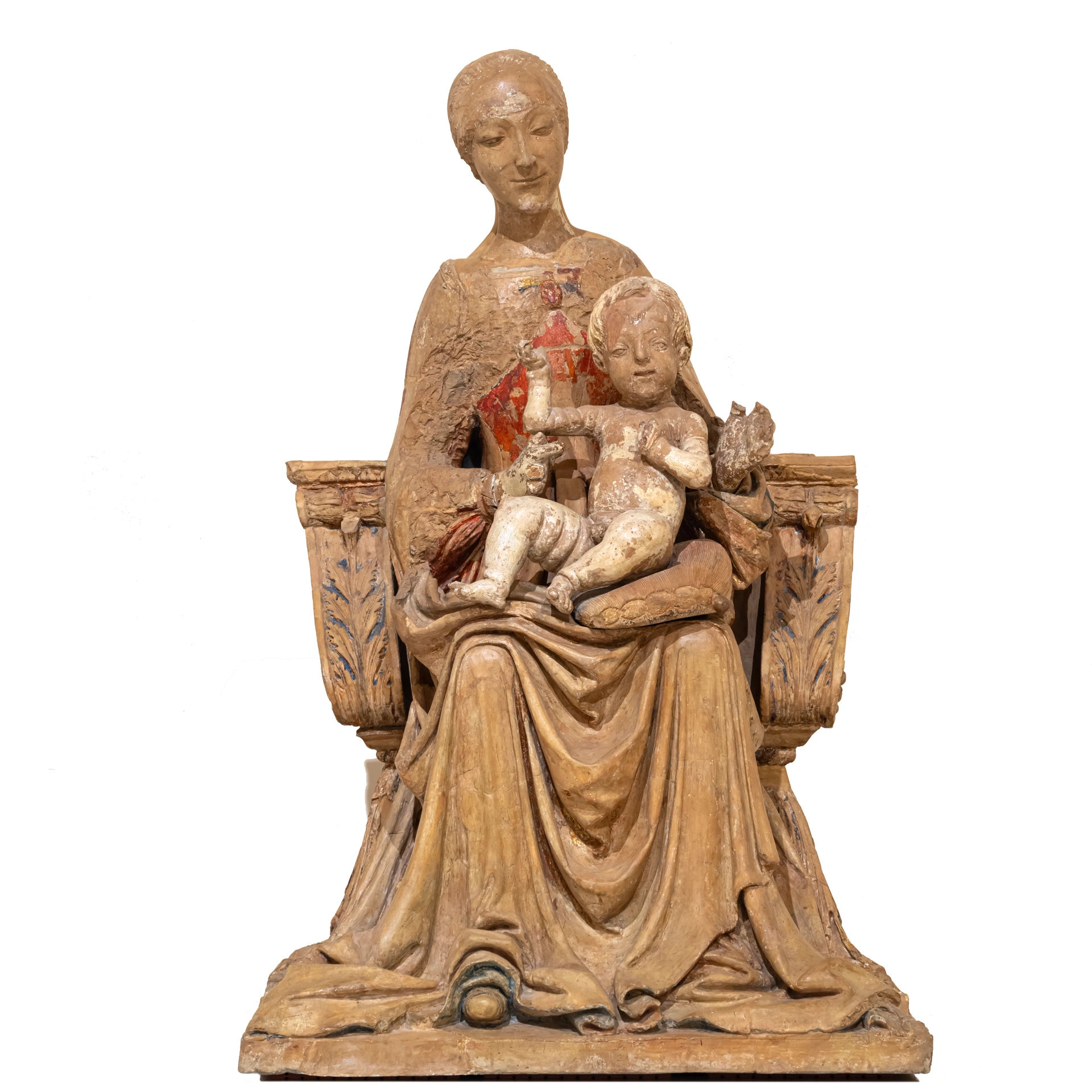 Seduta su un trono riccamente decorato e coperta da una veste che ricade a terra in un dettagliato e complicato panneggio, la Vergine mostra il Bambino nudo seduto su un cuscino. L’opera conserva parzialmente la sua policromia originale e mostra numerose tracce di doratura nelle pieghe dell’abito di Maria. La scultura era originariamente posta su un basamento ormai perduto, sul quale comparivano la firmata dell’artista e la datata 1498.