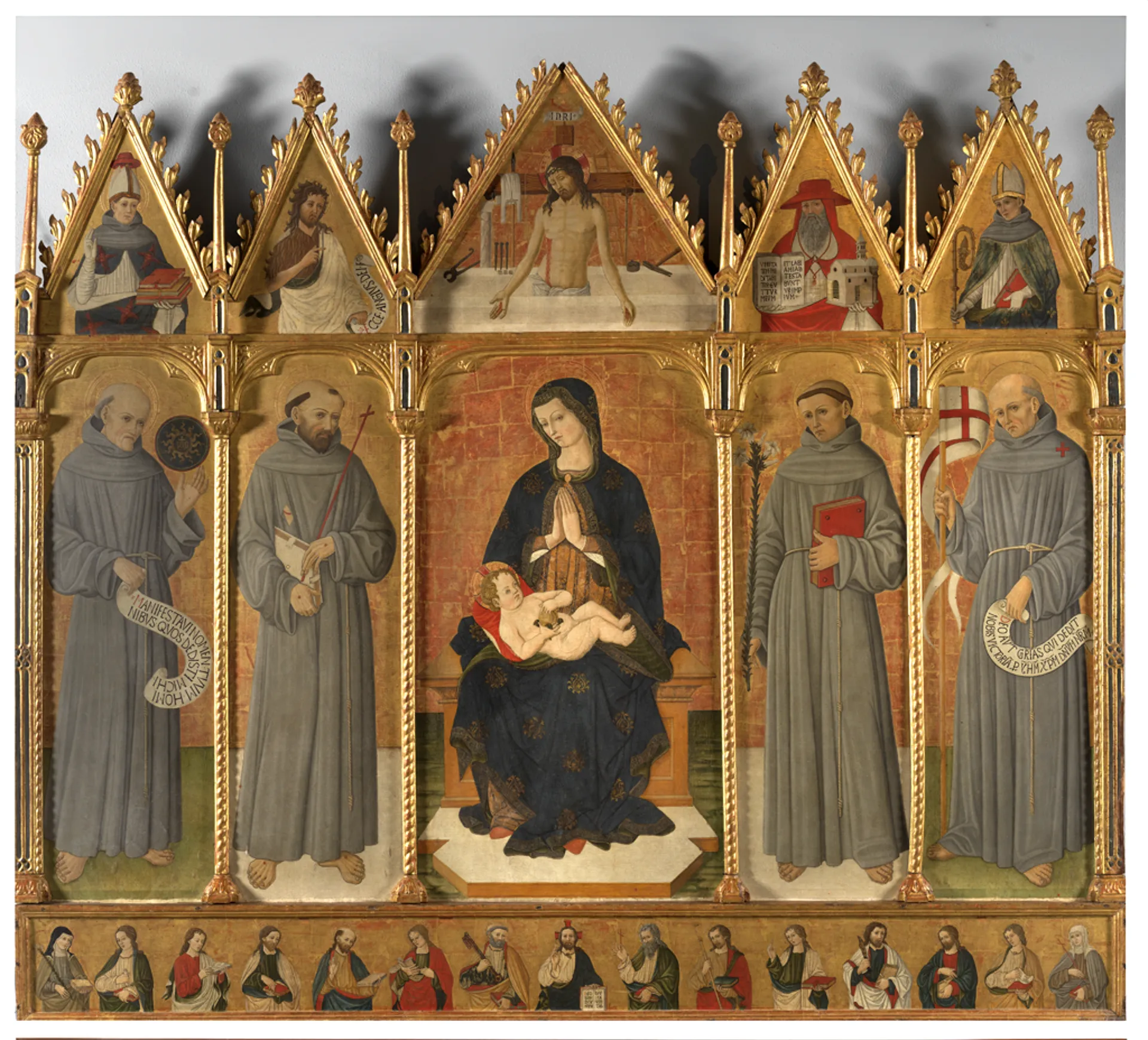 Il polittico mostra la Madonna con Bambino al centro affiancata da santi cari all’ordine francescano. A sinistra della Vergine in posizione di rilievo è ritratto il santo titolare del convento Francesco d’Assisi, mentre a destra sant’Antonio da Padova. I pannelli laterali sono occupati da figure di santi legati al territorio aquilano, Bernardino da Siena e Giovanni da Capestrano, fondatore del cenobio. Giovanni è l’unico personaggio raffigurato con nimbo raggiato, poiché venerato come beato ancor prima della sua effettiva beatificazione, avvenuta nel 1650. Le cuspidi in alto sono occupate al centro dalla figura di Cristo in pietà accompagnata dai simboli della passione, ai lati san Giovanni Battista, san Girolamo, san Bonaventura da Bagnoregio e san Ludovico da Tolosa.