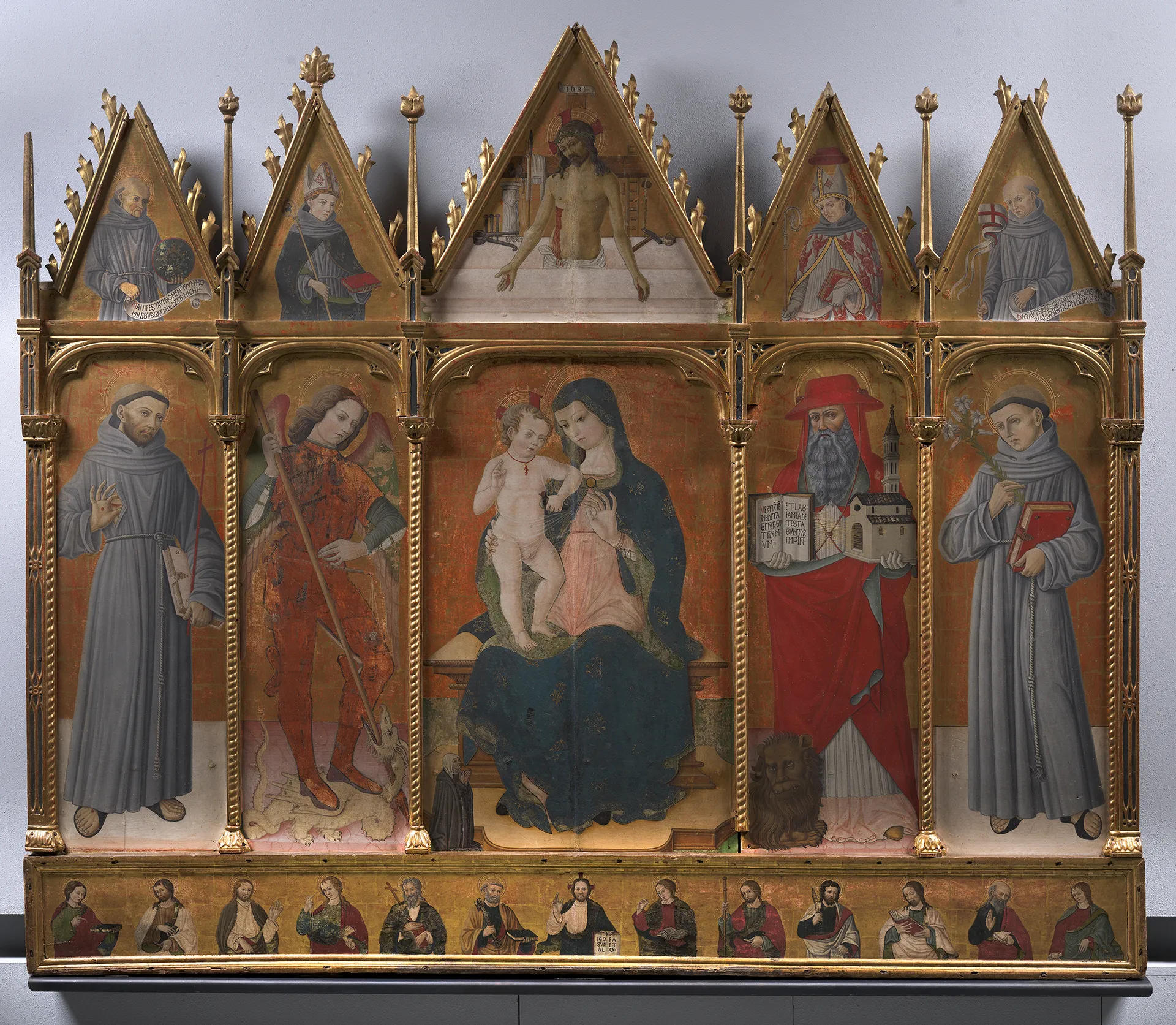 Il polittico mostra la Madonna con Bambino in trono circondata dai santi più importanti dell’ordine francescano. Ai piedi della Vergine è inginocchiata una suora, forse la badessa Sabetta del Terz’Ordine di San Francesco all’Aquila, che si adoperò per il passaggio del monastero di Sant’Angelo dalle monache benedettine ai frati minori dell’Osservanza, che vi si trasferirono nel 1481. I pannelli laterali sono occupati da san Francesco d’Assisi, san Michele Arcangelo, san Girolamo e sant’Anonio da Padova. La presenza di Michele Arcangelo in posizione preminente è un chiaro omaggio al santo titolare del complesso.