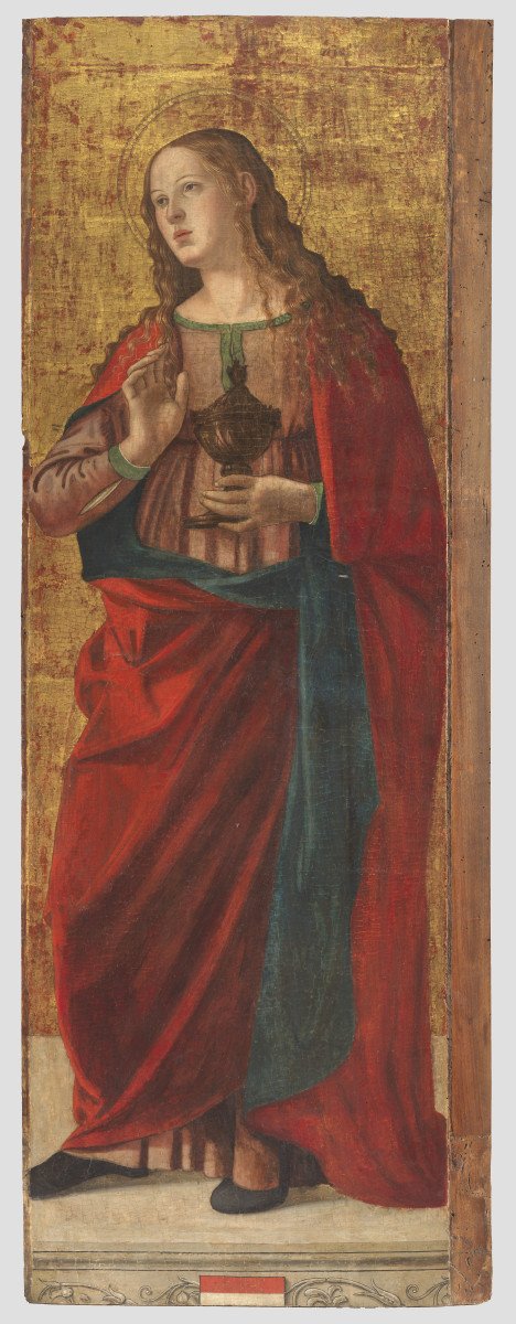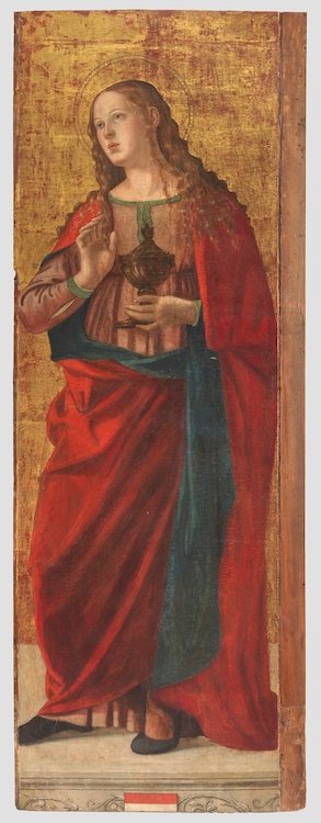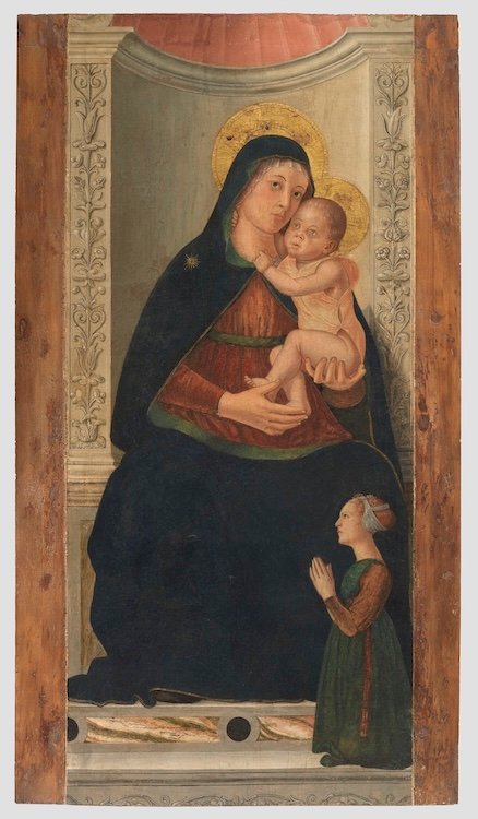Realizzato probabilmente come immagine per la devozione privata, oppure come pala d’altare destinata ad abbellire la cappella gentilizia di una chiesa, il trittico raffigura nel pannello centrale la Madonna con il Bambino, seduta su di un trono marmoreo decorato da candelabre di gusto antichizzante, accompagnata in basso dal ritratto di una donatrice orante. Nei due pannelli laterali sono rappresentati San Giovanni Battista, coperto di pelli di cammello, mentre stringe con la mano sinistra il bastone sormontato da una croce e il rotolo con la scritta “Ecce agnus Dei”, e Maria Maddalena, riconoscibile dal vaso con gli unguenti che tiene nella sinistra. Il dipinto si presenta come un insieme di tre tavole ormai private della loro originale carpenteria lignea, certamente ritagliate in epoca remota per uniformare le dimensioni dei tre pannelli. Tracce di questa manomissione si riscontrano nell’assenza della parte superiore del trono della Vergine nella tavola centrale e nella perdita della porzione inferiore del fregio sottostante, recuperato grazie a un restauro non datato, dove si trovavano in origine due stemmi gentilizi ormai perduti.