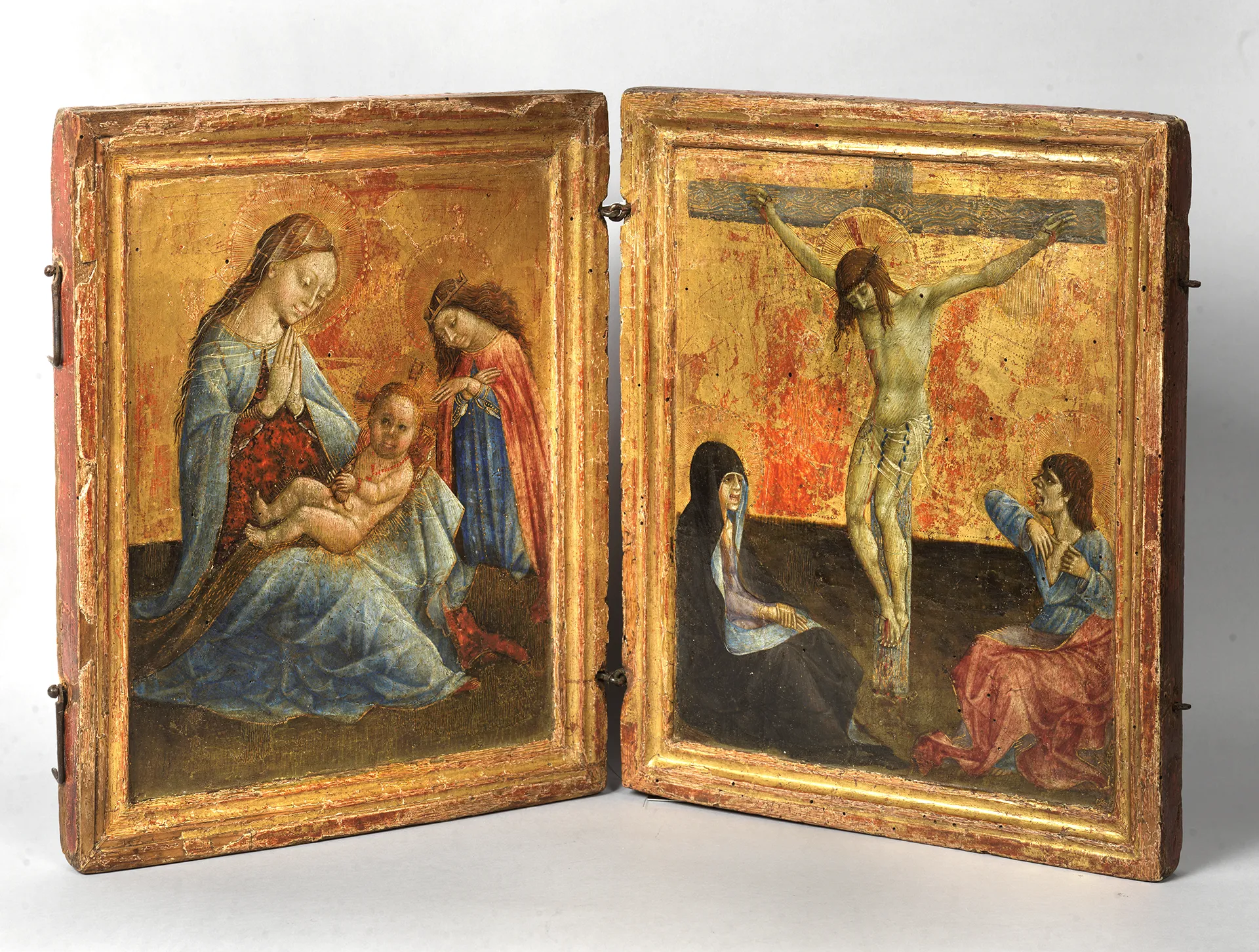 Questo altarolo devozionale portatile, composto da due tavolette unite insieme da cerniere apribili e fornito di ganci di chiusura, è opera del pittore abruzzese Andrea Delitio, artista di passaggio tra Tardogotico e Rinascimento. L’altarolo presenta a sinistra la Madonna in adorazione del Bambino, che tiene tra le manine un animale (forse un ermellino), alla presenza di santa Caterina, e a destra la Crocifissione con i dolenti. L’opera mostra uno stile espressionistico ancora legato a retaggi dell’arte gotica.
