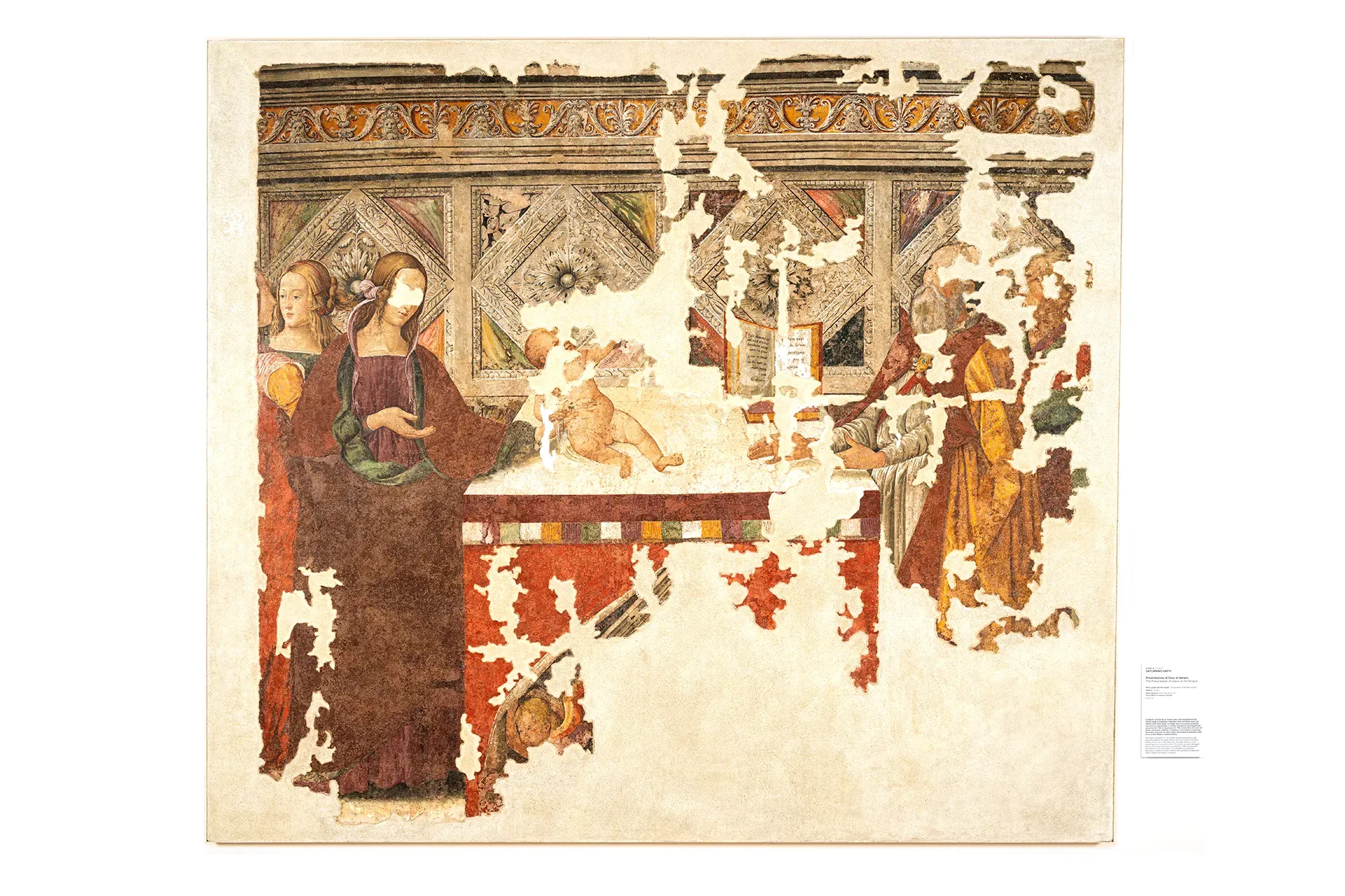 La Vergine, avvolta da un manto rosso, accompagnata da due donne, porge al sacerdote il Bambino nudo sull’altare, dove, sul davanti nella parte bassa, un angelo apre una cortina scoprendo uno stemma oggi perduto. La chiesa, gravemente danneggiata dal terremoto del 1703, fu soppressa nel 1795 e riassorbita nel corso del tempo nel tessuto cittadino. Conteneva al suo interno un apparato decorativo realizzato da artisti legati alla bottega di Saturnino Gatti di cui questo affresco è testimonianza.