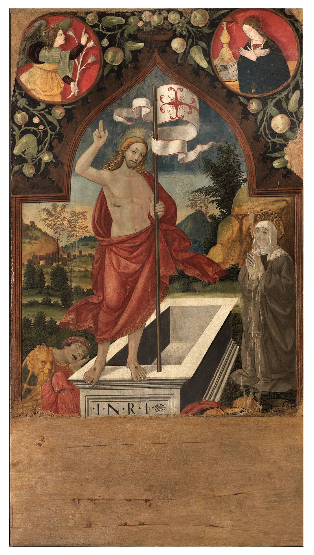 Insieme alla tavola raffigurante Gesù pellegrino esposta qui accanto, questo dipinto era posto a far da sportello dell’urna contenente il corpo del beato Bernardino da Fossa campione dell’Osservanza francescana, traslato nel 1515 dal convento aquilano di San Giuliano al convento di Sant’Angelo d’Ocre. La parte inferiore della composizione fu tagliata di circa 45 cm e per questo, per ridare armonia alla composizione, durante un restauro nel 1967 è stata integrata a tinta neutra.