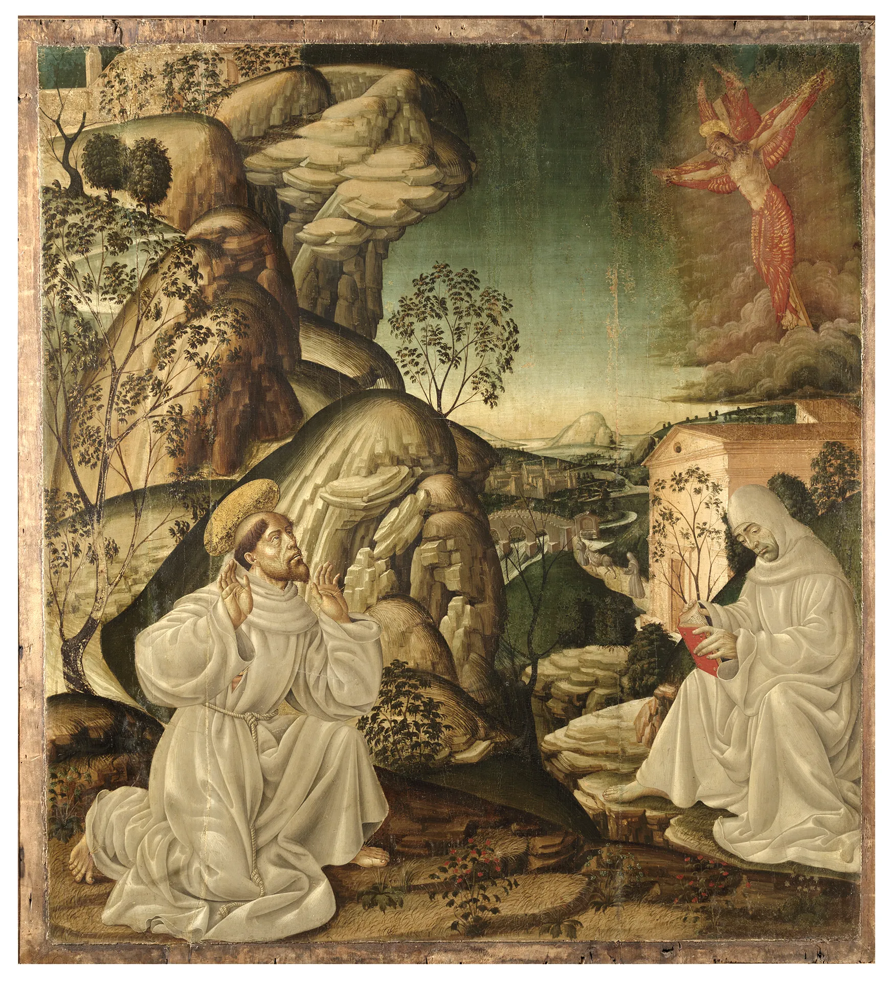 In primo piano a sinistra san Francesco d’Assisi, avvolto in un ampio saio, riceve le stimmate da Cristo che gli appare in cielo in forma di serafino. In basso a destra è raffigurato il compagno fra Leone, seduto in prossimità di una chiesa e intento ad aprire il sacro libro dei Vangeli su richiesta dello stesso Francesco. Alle spalle del santo fa da quinta l’aspra sommità rocciosa della Verna, oltre la quale si distende un vasto paesaggio collinare con un ponte sul fiume e una città in lontananza.
