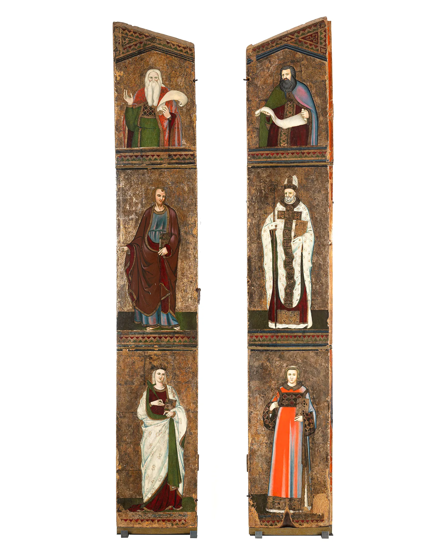 Le due tavole erano in origine gli sportelli laterali del tabernacolo cuspidato che racchiudeva la statua lignea di santa Lucia. Nel 1914 la teca fu trasferita nella chiesa della Santissima Annunziata a Rocca di Cambio (L’Aquila), dove tuttora si trova la scultura, fino al terremoto del 1915 che provocò il crollo parziale della parrocchiale. Disperse nel mercato antiquario, le tavole sono state acquisite nel 2020 da una collezione privata fiorentina. Nella parte superiore degli sportelli sono raffigurati due profeti; nella parte mediana un santo vescovo e san Paolo; nel registro inferiore due santi martiri, verosimilmente Lorenzo e Caterina d’Alessandria.