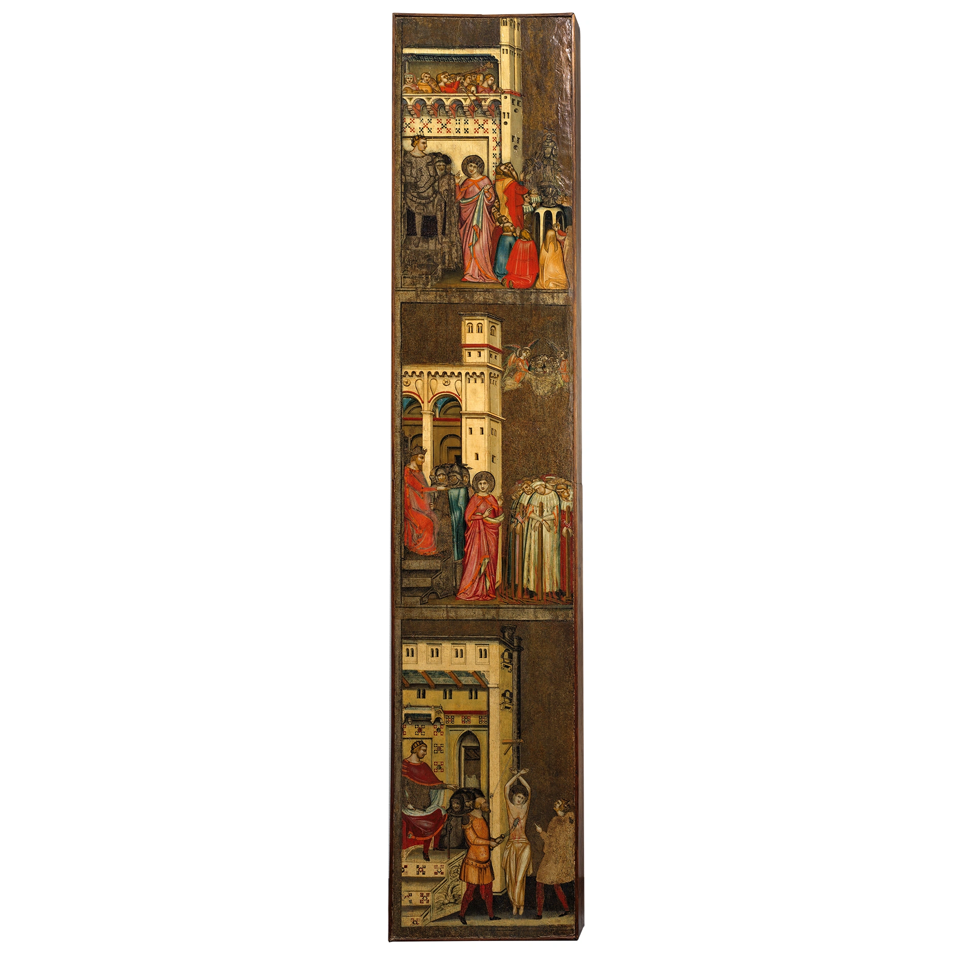 I due sportelli, già pertinenti a un tabernacolo raffigurante episodi della vita di santa Caterina d’Alessandria, provengono con ogni probabilità dal convento di Santa Caterina Martire intra moenia all’Aquila, dove furono trasferiti in seguito all’abbandono del primitivo convento di Santa Caterina extra moenia, in San Vittorino (L’Aquila), avvenuto dopo la peste del 1368. Questa ipotesi suggerisce una comune origine con la statua lignea di santa Caterina d’Alessandria, qui esposta, e lascia supporre che i due sportelli e la statua facessero parte di uno stesso tabernacolo. Le scene seguono il racconto della vita della santa narrato nella Legenda Aurea di Jacopo da Varagine. Caterina rifiuta di adorare gli idoli; la disputa con i filosofi e il loro successivo martirio; la flagellazione di Caterina; la conversione della moglie dell’imperatore Massenzio e del capo delle guardie, Porfirio; Caterina sottoposta alla tortura delle ruote chiodate, miracolosamente distrutte da un angelo; infine, il martirio per decapitazione e il trasporto del suo corpo sul Monte Sinai.